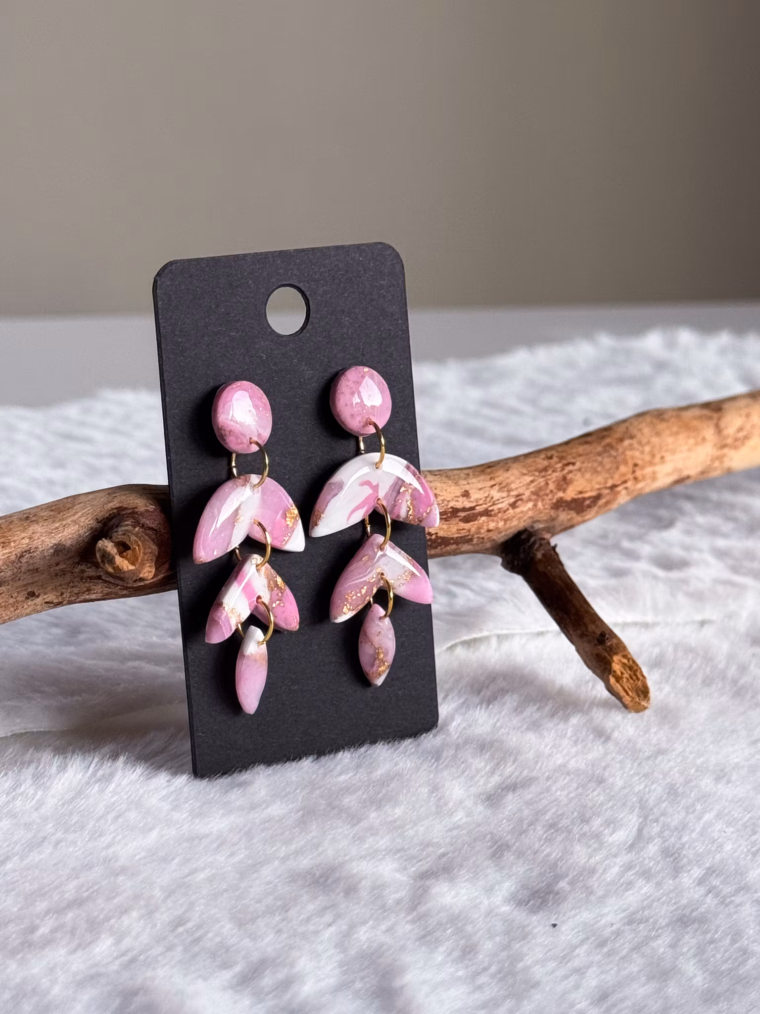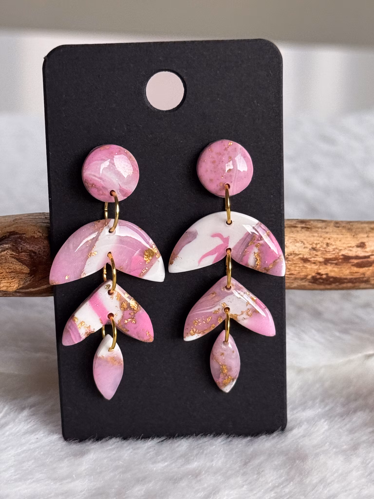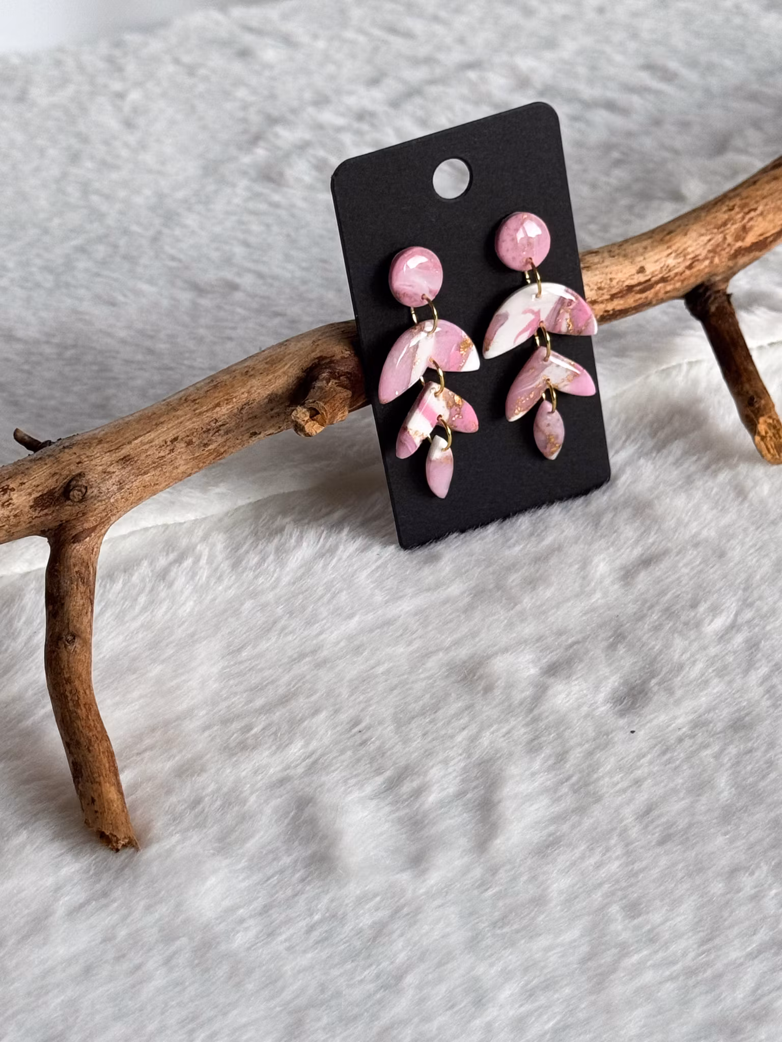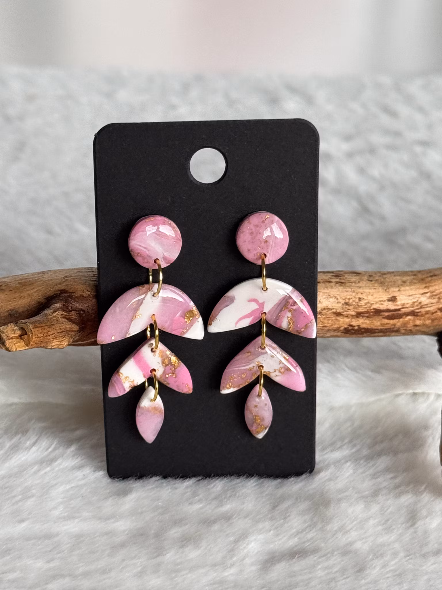 Rosa marmorerade örhängen i rosa, vitt och guld. Handgjorda av mig i polymerlera och resin