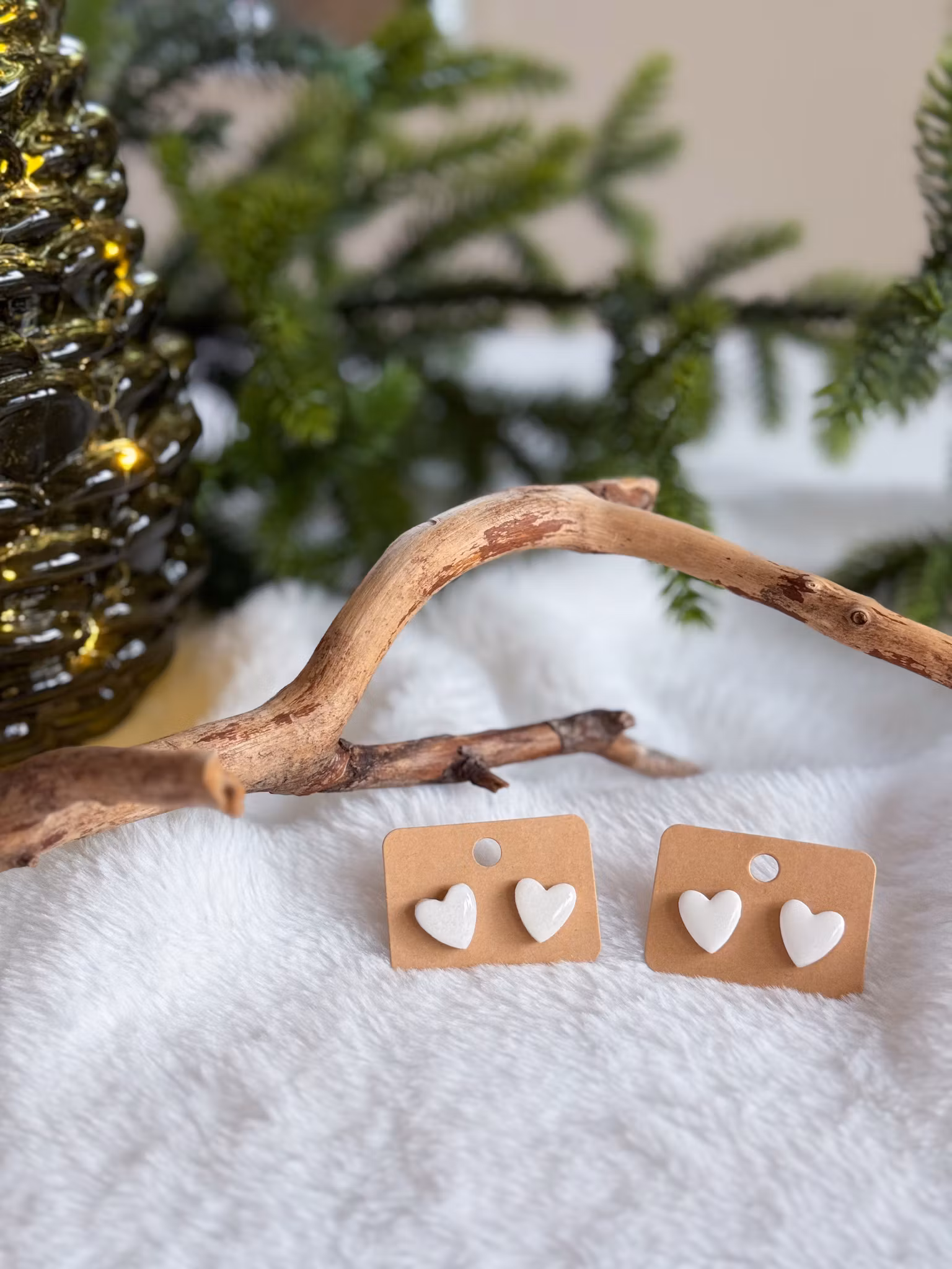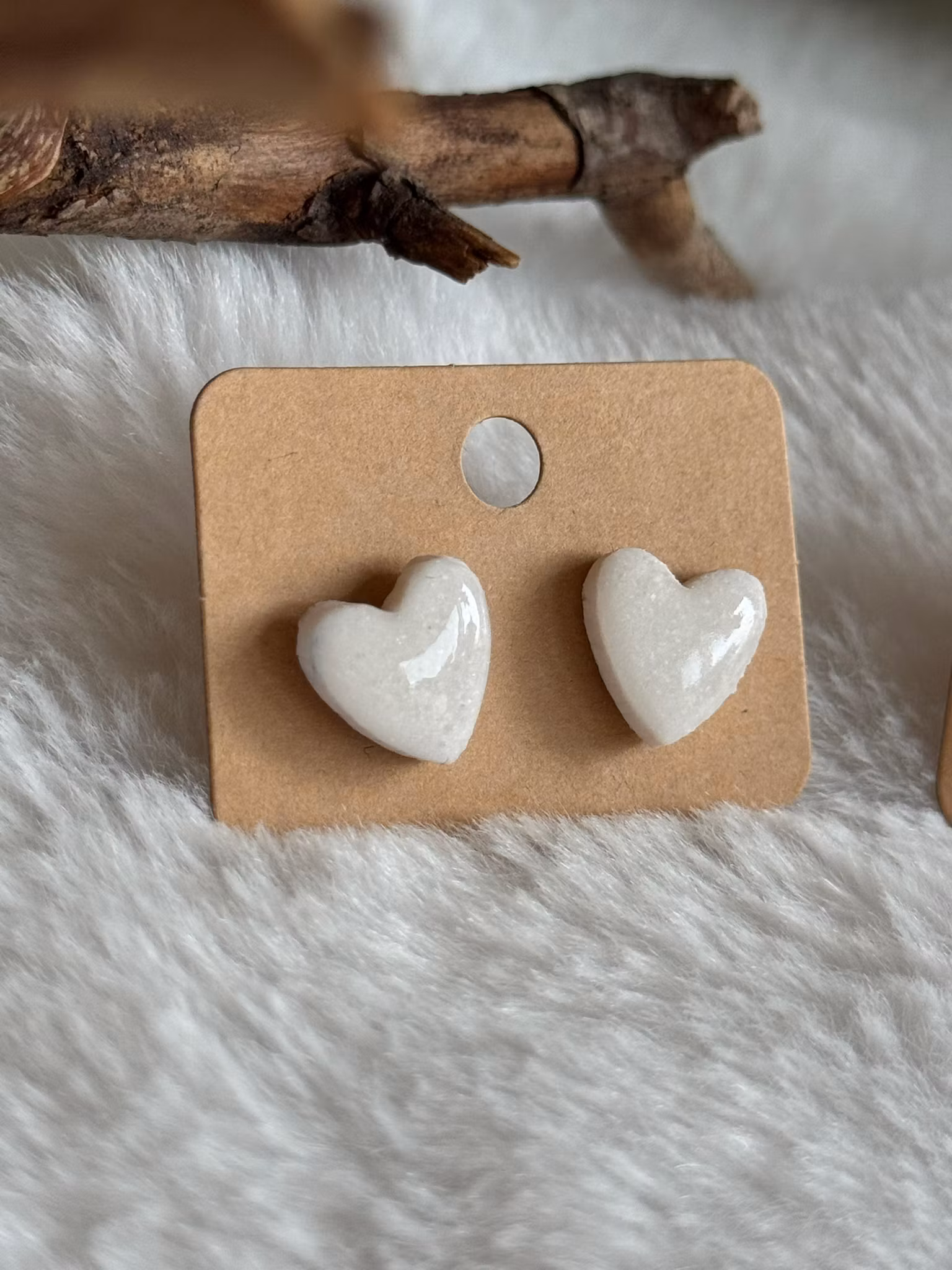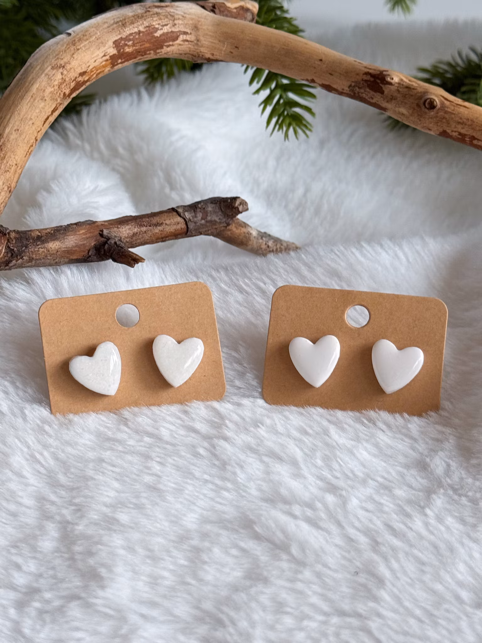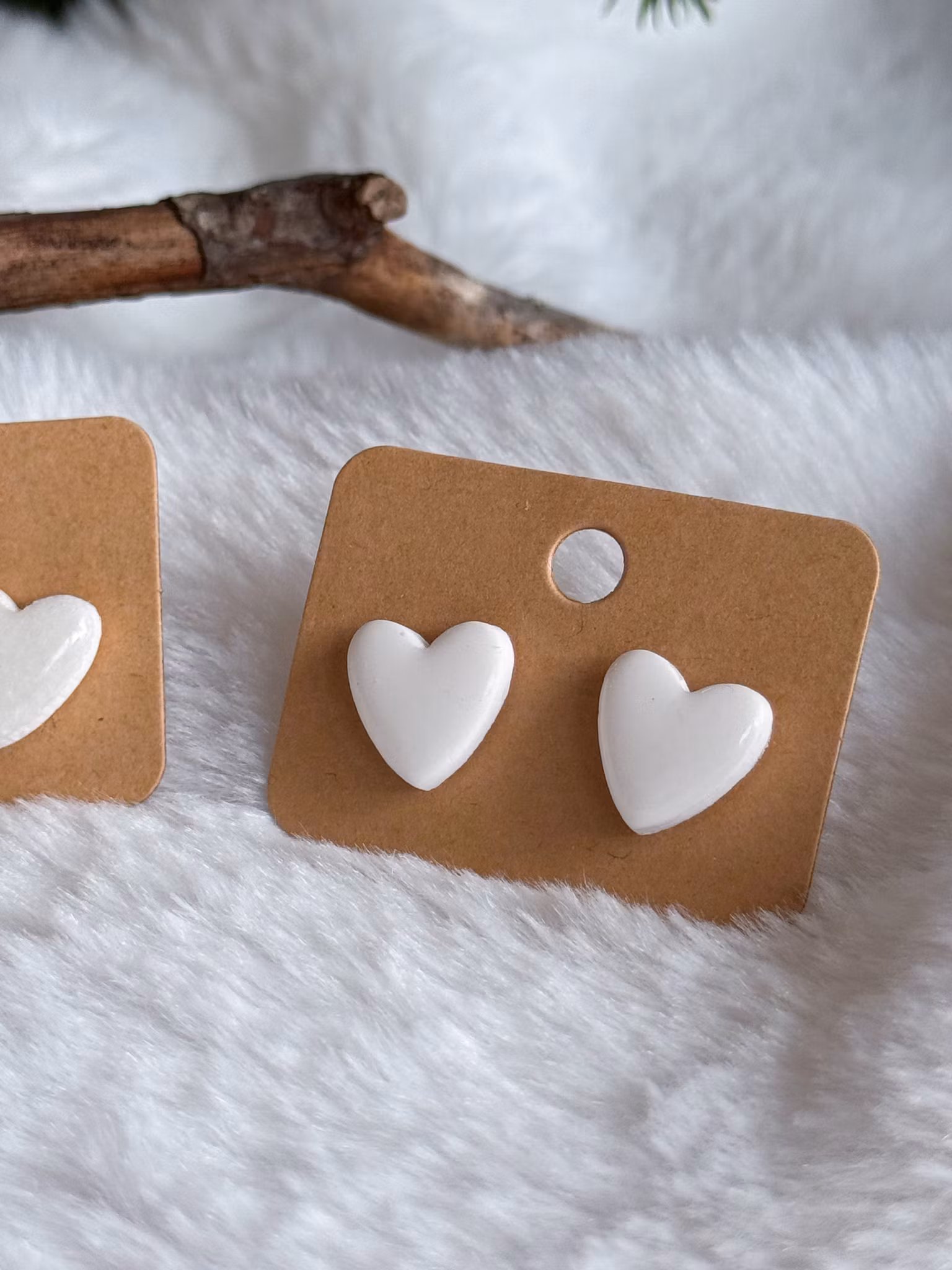 Ett par stiftörhängen med vita hjärtan. Välj med eller utan skimmer. Handgjorda av mig i polymerlera och resin